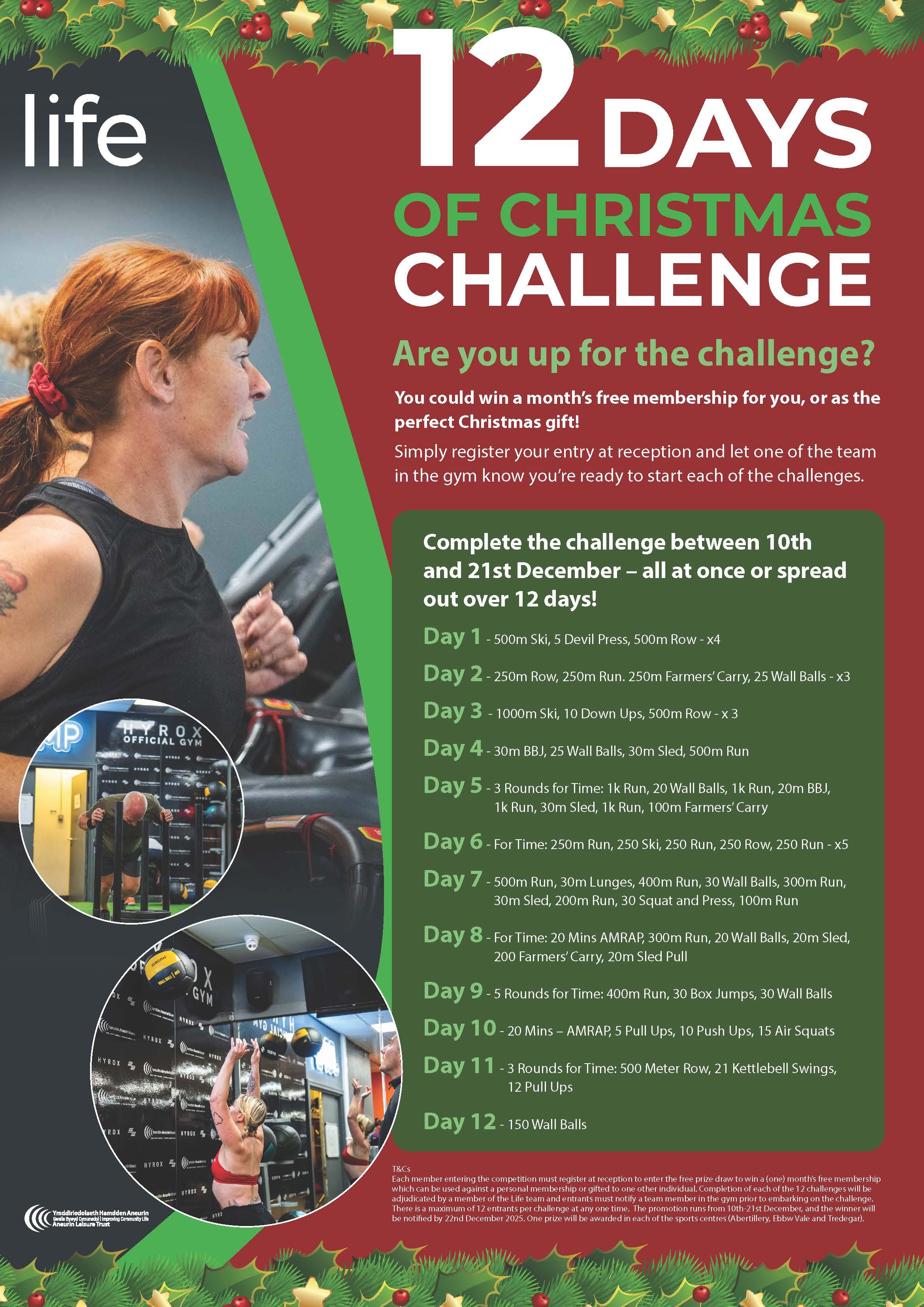 Each member entering the competition must register at reception to enter the free prize draw to win a (one) month’s free membership which can be used against a personal membership or gifted to one other individual. Completion of each of the 12 challenges will be adjudicated by a member of the Life team and entrants must notify a team member in the gym prior to embarking on the challenge. There is a maximum of 12 entrants per challenge at any one time. The promotion runs from 10th-21st December, and the winner will be notified by 22nd December 2025. One prize will be awarded in each of the sports centres (Abertillery, Ebbw Vale and Tredegar).