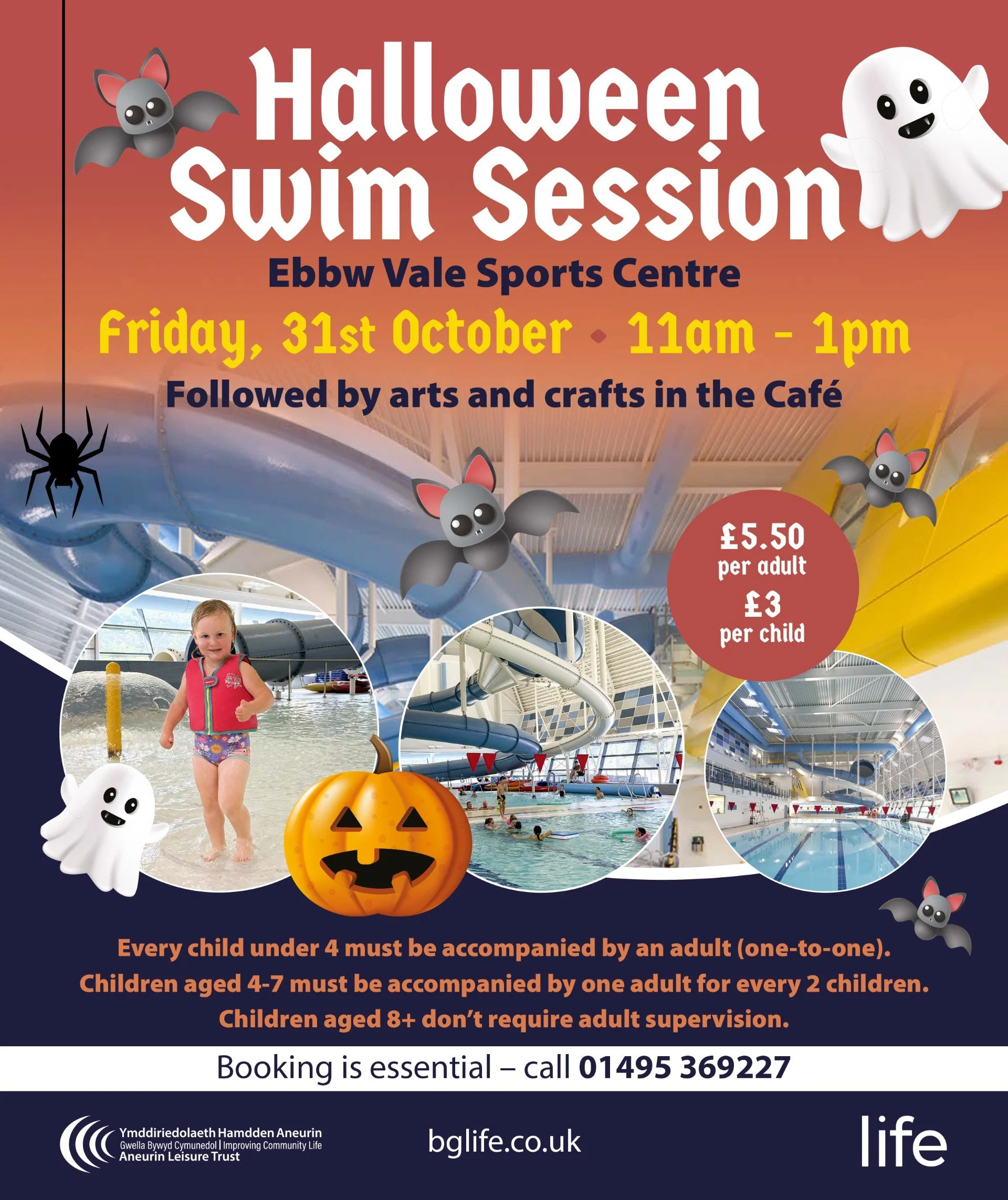 Join us for a fun filled Halloween themed swim session at Ebbw Vale sports centre, followed by arts and crafts in the café!